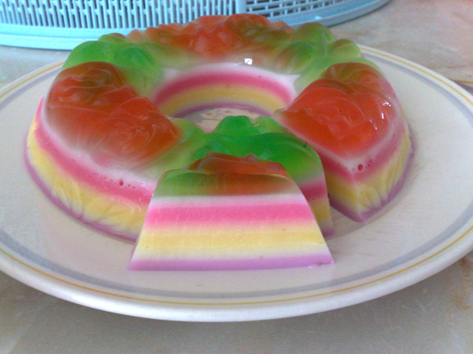 3. 将(2)一层层倒在8寸模内,待一层稍微凝固再倒另一层,重复至完,放入冰箱冷却,凝固后切块,沾上椰丝即可享用.